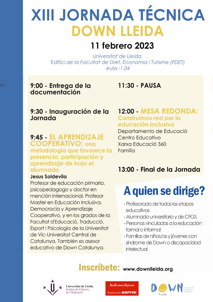 El día 11 de febrero se celebrará la XII Jornada Técnica DOWN LLEIDA sobre educación inclusiva, dirigida a docentes, familias, alumnado y todas aquellas personas con interés por la temática.