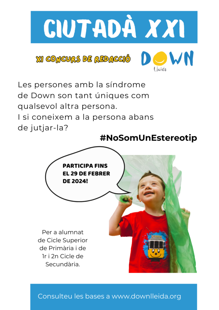 DOWN LLEIDA convoca el XI Concurs de Redacció CIUTADÀ XXI. Un concurs destinat a alumnat de Cicle Superior de Primària i de 1r i 2n Cicle de Secundària.